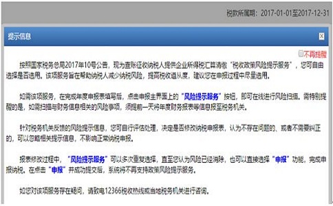 1、 您在申报页面点击“所得税年度A类申报”后,系统将给出风险提示服务相关提示语。