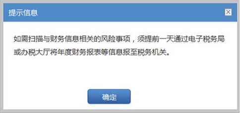 3、系统将首先给出前置条件提示信息:如需扫描与财务信息相关的风险事项,须提前一天将年度财务报表等信息报至税务机关。