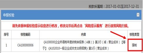 4、点击*三步提示框中的“确定”按钮后如果跳出申报强制校验信息,请您先依据申报校验提示信息进行修改,修改完毕后可再次点击“风险提示服务”,系统将为您进行政策风险扫描。