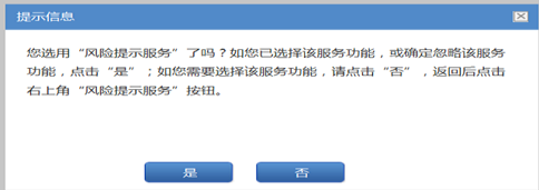 8、 点击“申报”按钮再次给出风险提示服务的相关提示,选择“是”继续申报,选择“否”则返回列表页面,继续选用“风险提示服务”后再申报。