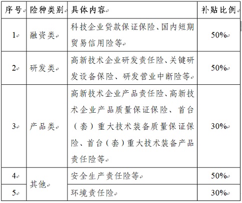 2. 科技保险费补贴:对科技型中小企业支付的科技保险费或企业参与经认定的金融创新产品支付的科技保险费给予30-50%的补贴,上限10万元,具体险种及补贴比例如下: