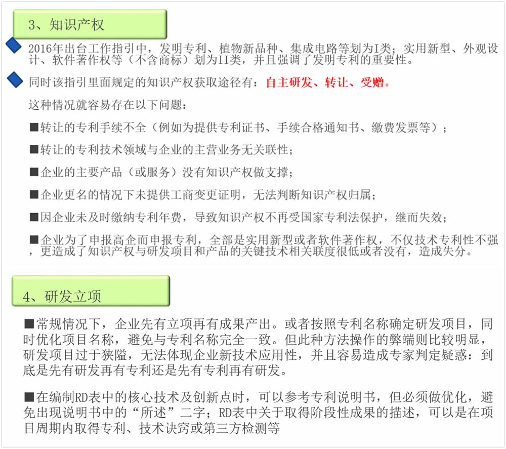 近些年来,高新技术企业认定失败的案例屡见不鲜,甚至有部分企业被取消高新技术企业资格的报道也屡见报端,这其中究竟会存在哪些问题呢?众说纷纭,使得问题本身的解决方案也各不相同,但*终不能成为真正有效的解决方案。因为从业的相关人员并没有从本身高新技术企业内在的逻辑关系和企业当前的实际情况去考量,始终停留在材料和数据的表面,更何况数据具有既定性和不可更改性,特别是财务数据,继而进入申报时一味的进行文字包装和修饰,*终导致认定失败,并没有去改变企业本身在运营和日常活动中存在的实际问题。另外一方面,高新技术企业缺乏一定的风险意识,在每年享受税收利好的同时严重忽视了高新技术企业这个体系对于企业提出的各种要求,甚至是更高要求,一劳永逸的思想禁锢了企业本身在这个很小的领域的提升动力。当然出现这些问题的因素很多,例如企业内部人员兼职管控、企业内部人员不够专业、外部辅导机构不负责任等,那么究竟如何在一定程度上去尽量规避这些风险呢?智为铭略小编在此做一点简单的基础性分享,首先分享高新技术企业认定失败的常见原因,具体如下: