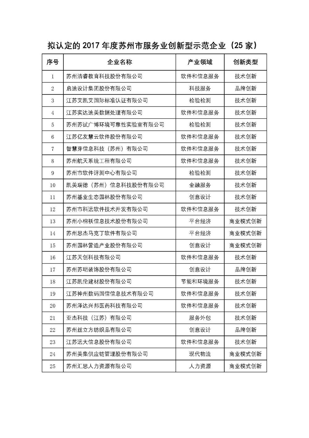 2017年度苏州市服务业创新示范企业名单公示