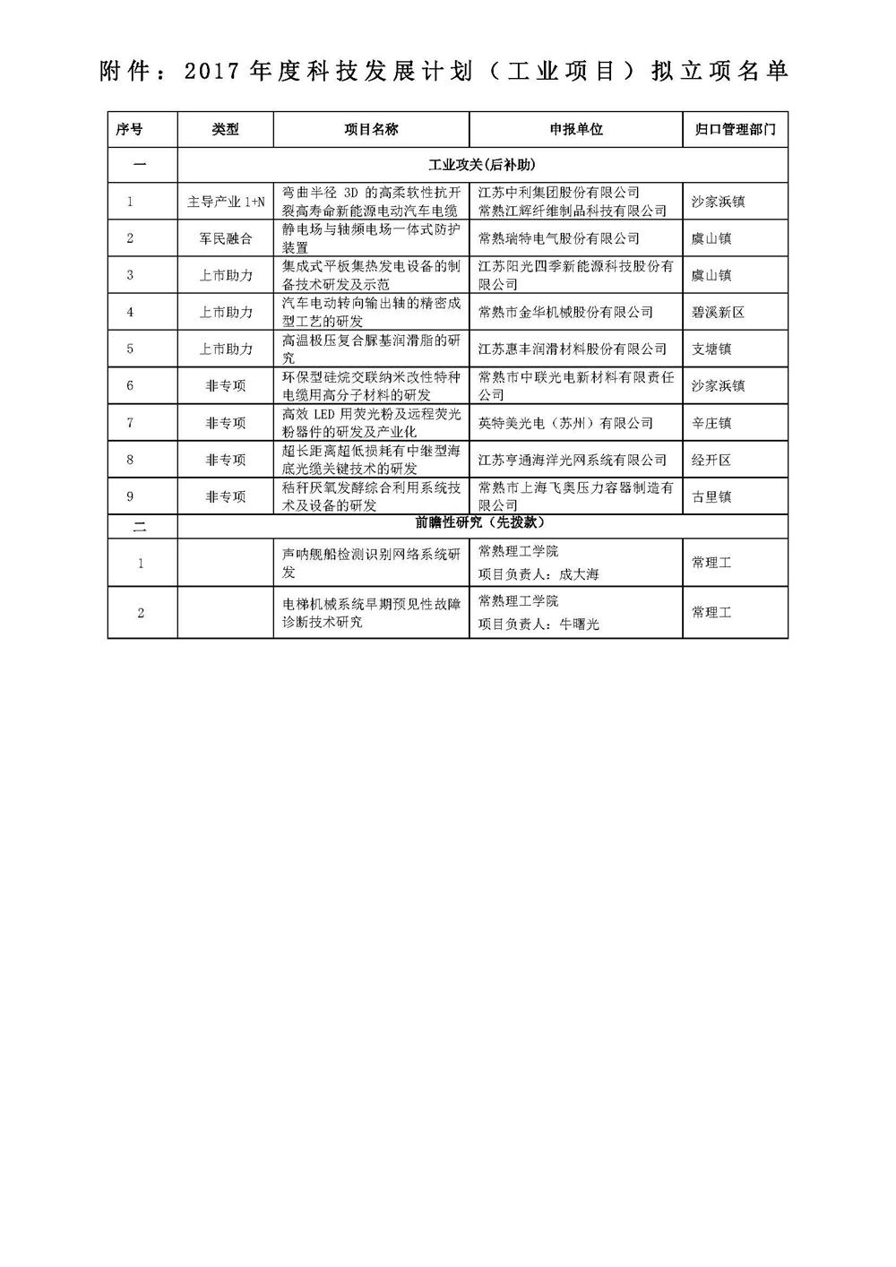 2017年度常熟市科技发展计划(工业项目)拟立项名单