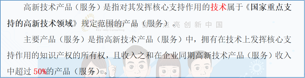 首先,对于申请成为高新技术企业的单位来说,必须清楚地认识到高新技术产品和主要的产品(服务)指的是什么。这一点在《高新技术企业认定管理工作指引》(国科发火〔2016〕195号)文件中已经给出了清晰的界定: